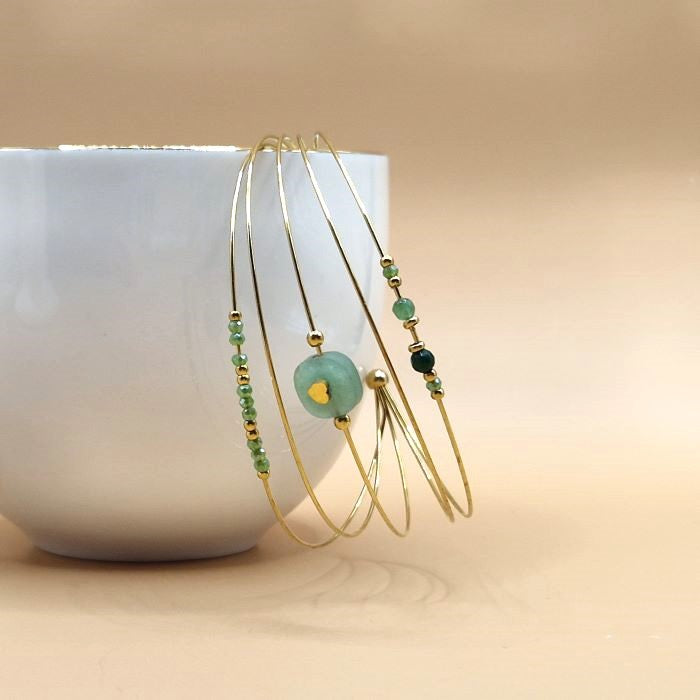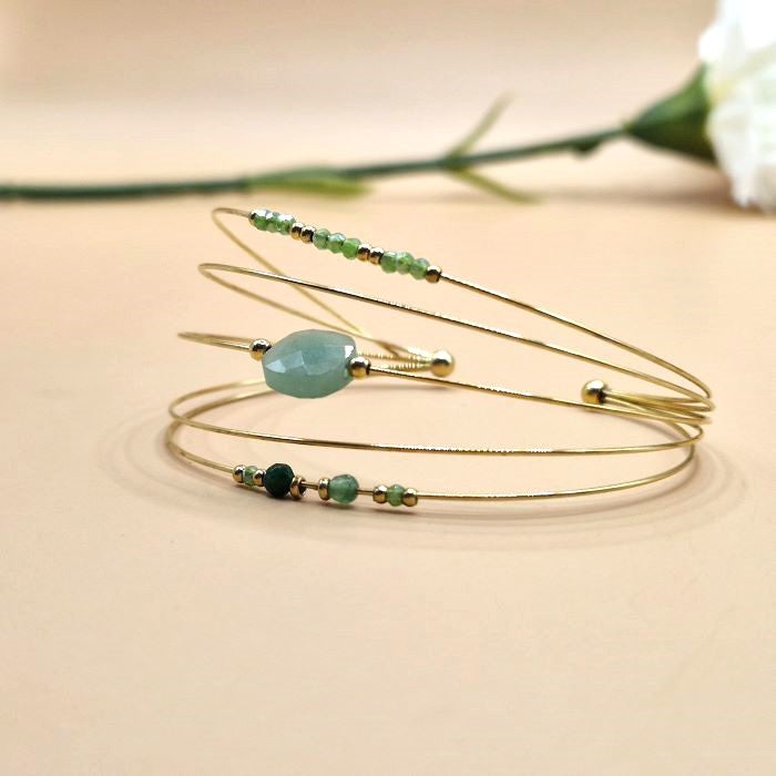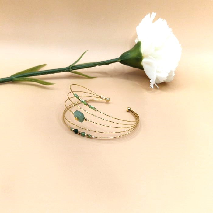 Bratara aurie, deschisa si flexibila, lucrata in linii delicate, cu pietre naturale din aventurin. Aventurinul este o piatra naturala ce face parte din familia cuartului. Este o piatra blanda, care da un sentiment de calm si echilibru. Aceasta bratara deosebita si fina este lucrata cu migala, iar piesele de decor, inclusiv pietrele de aventurin, sunt slefuite cu o deosebita atentie la detaliu, conferindu-le o frumusete si o stralucire aparte.