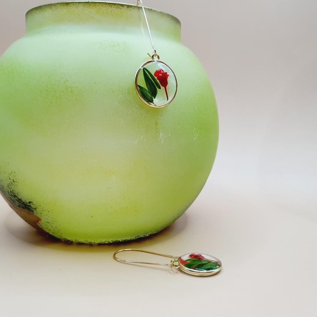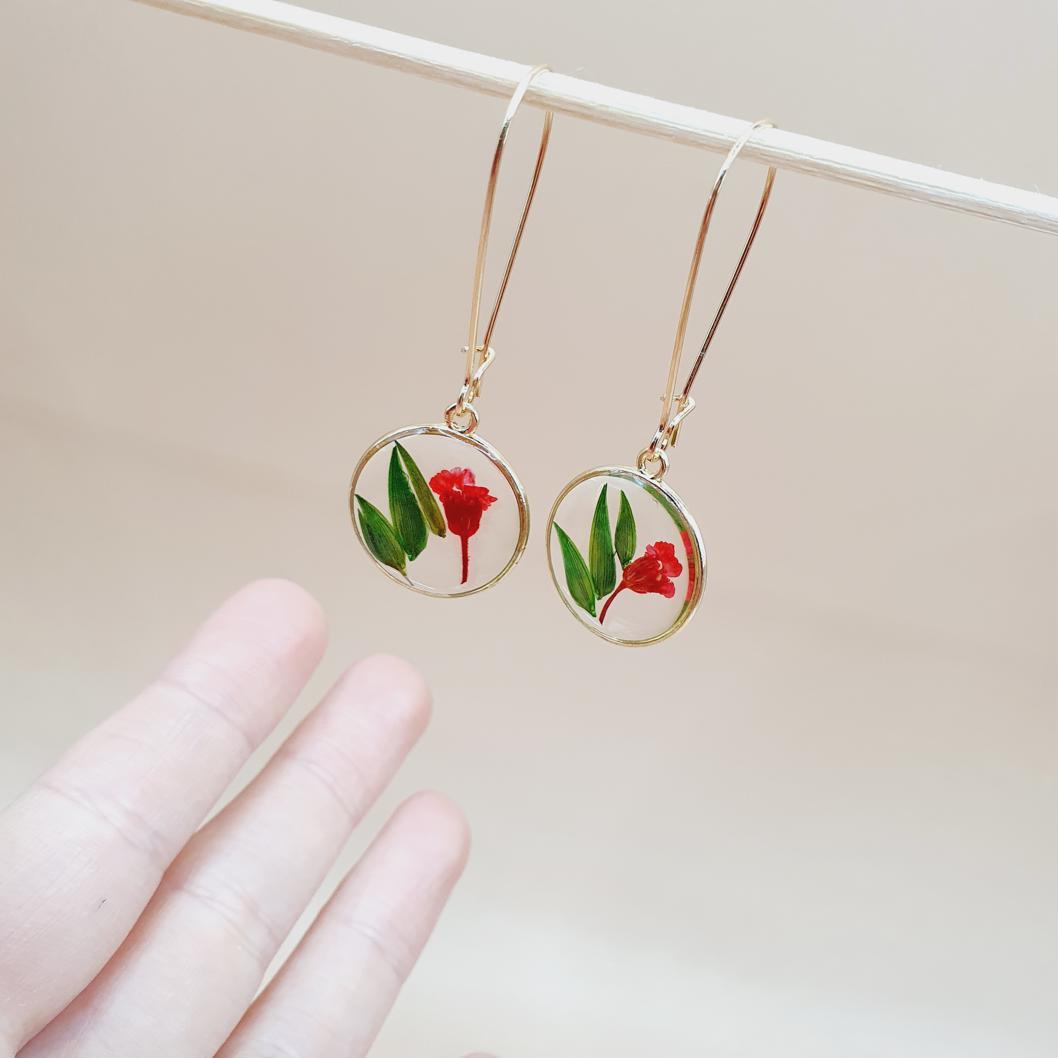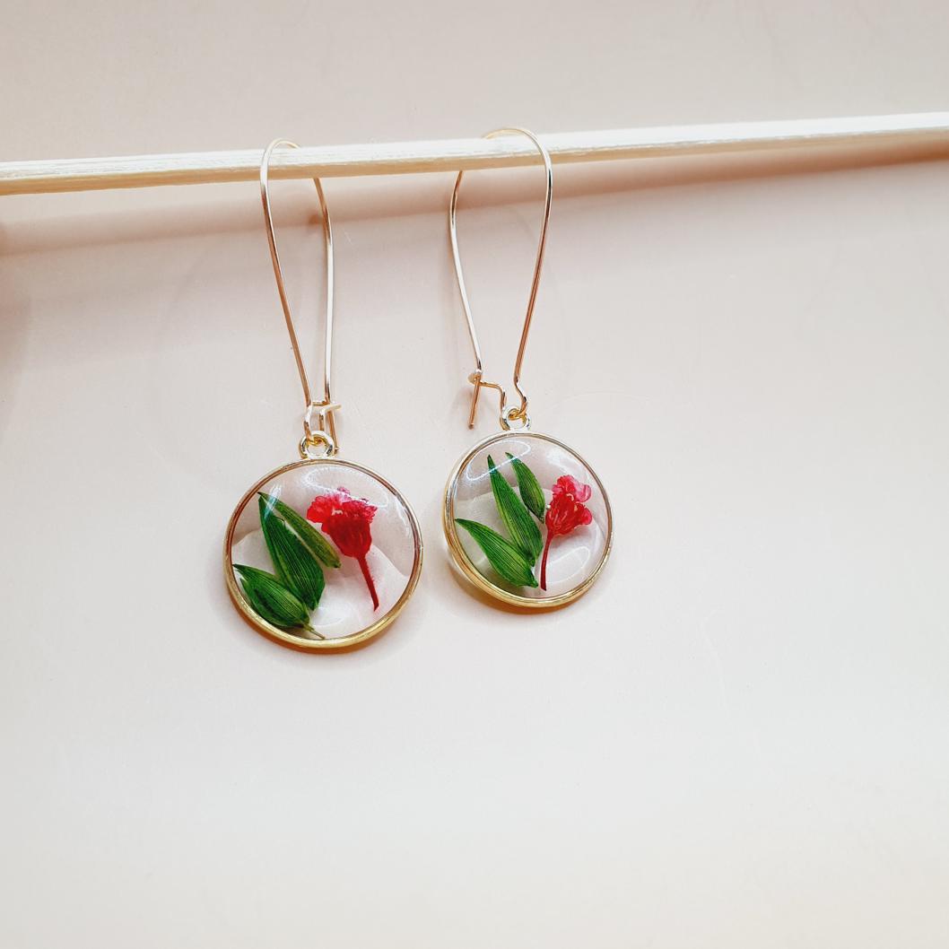 Descopera farmecul in cerceii din rasina cu floare rosie presata. Acesti cercei cu tortita sunt lucrari de arta miniaturala, perfecti pentru a adauga un strop de primavara tinutei tale. Ofera un martisor sau poarta cu bucurie acesti cercei inspirati din natura.