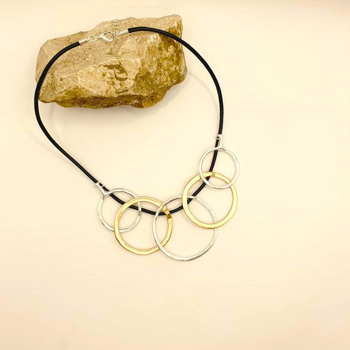 - Design: colier la baza gatului (snur negru), pandantiv cu cercuri stilizate in nuante de auriu si argintiu