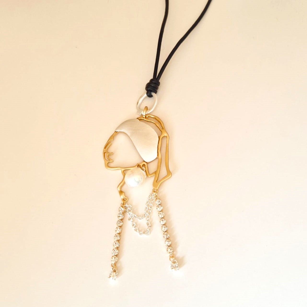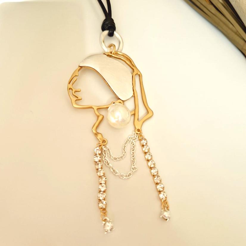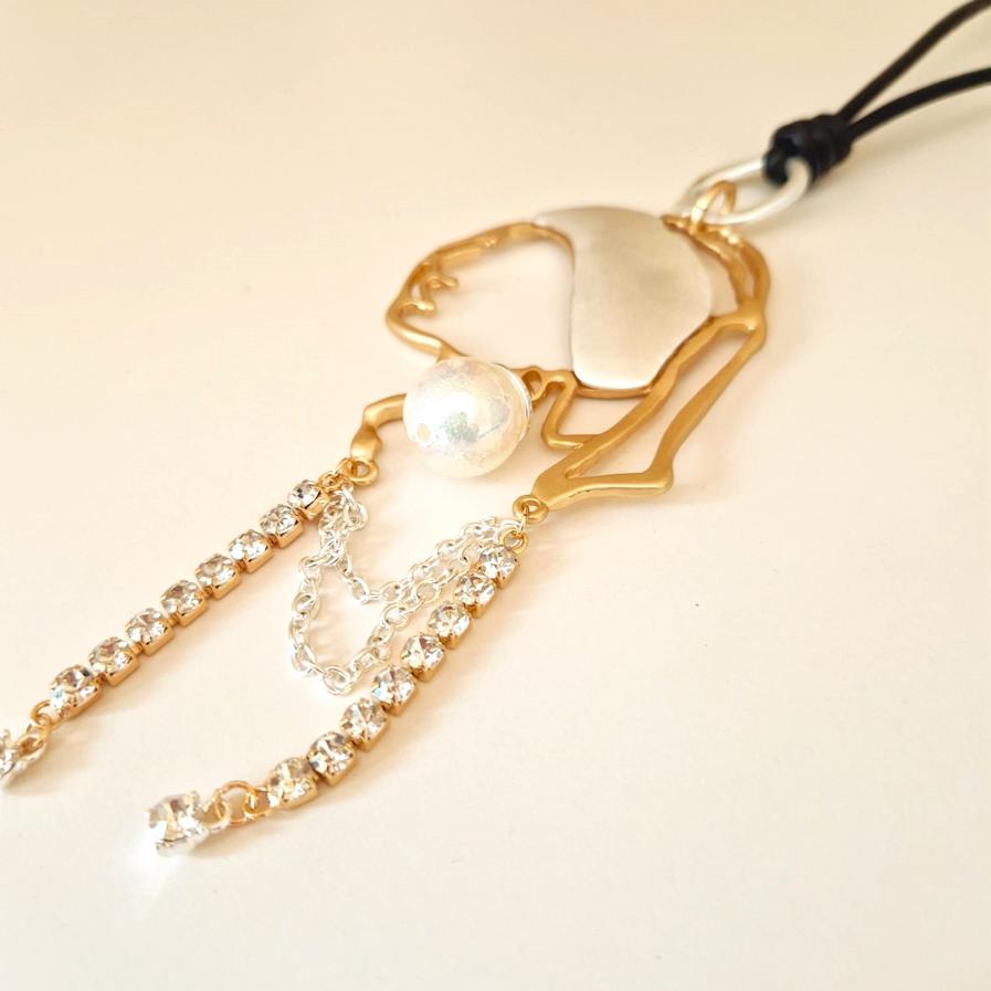 - Material: snur din piele ecologica neagra, pandantiv cu mix auriu/argintiu, perla imitatie