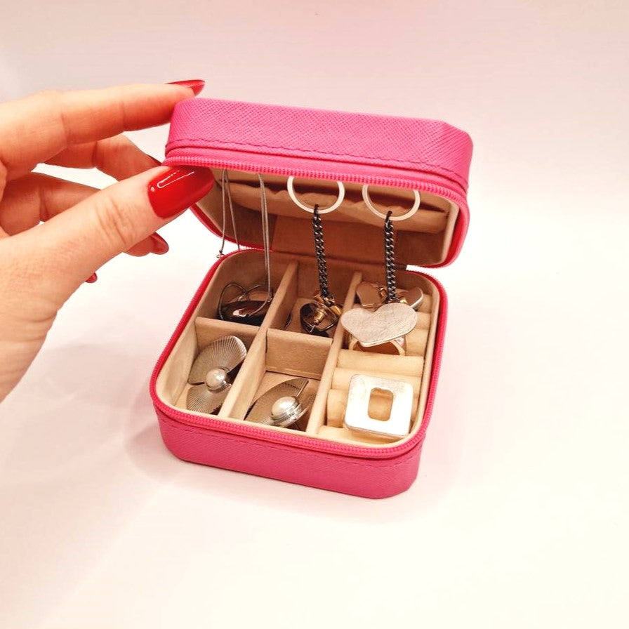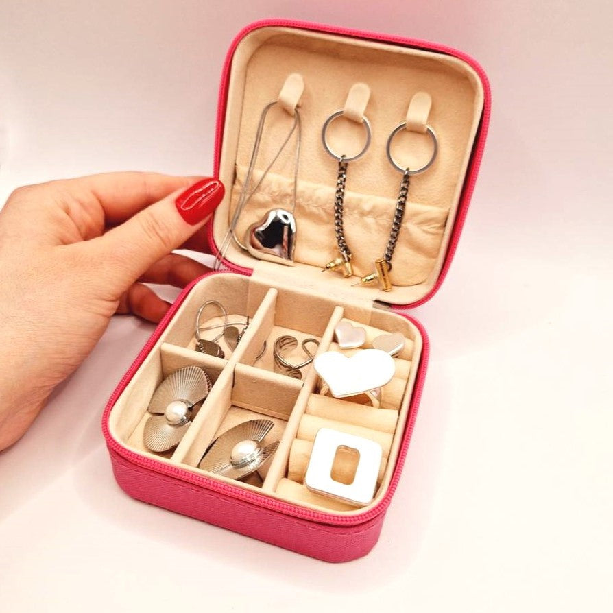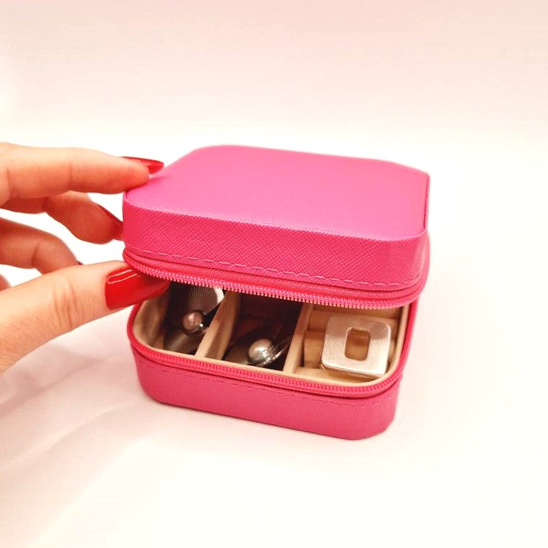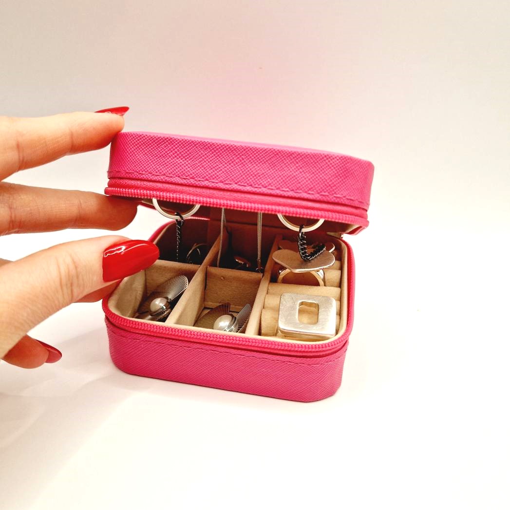 Cutia de bijuterii de dimensiuni reduse este partenerul ideal pentru orice calatorie. Compacta si practica, te ajuta sa-ti protejezi si sa-ti organizezi bijuteriile. Cu compartimente detasabile si un design ergonomic, iti ofera acces usor la bijuteriile tale preferate. Confectionata din materiale de calitate, cu un interior textil moale si un exterior din piele ecologica, aceasta cutie are dimensiunile perfecte (10 cm x 10 cm x 5 cm) pentru a fi transportata fara efort. Este si usoara, astfel ca o poti lua in geanta de mana sau in bagajul tau de calatorie. Inchidere cu fermoar.