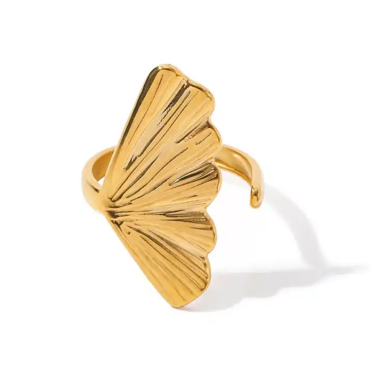 Inel inox, circumferinta deschisa, cu model frunza de ginkco biloba, rezistent la apa.