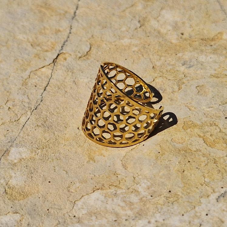 Adauga un strop de originalitate si stil garderobei tale cu inelul reglabil Honey, o bijuterie moderna si sofisticata. Acest inel lat, realizat din otel inoxidabil auriu, se remarca prin designul sau unic, inspirat de structura unui fagure de miere. Modelul care imita perfect fagurele, adauga un element de rafinament si eleganta acestui accesoriu deosebit.